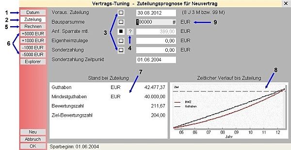 Im Fall der Zuteilungsoptimierung können Sie unterschiedliche Rechenziele bestimmen. Klicken Sie dazu den jeweiligen Rechenziel-Schalter (3) an. Geben Sie in den übrigen Eingabefeldern die weiteren Vertragsdaten ein und klicken Sie den Berechnungs-Schalter (4) an. ( (5) hat die gleiche Funktion.) Das Rechenziel wird bestimmt und Vertragsdaten (7) sowie grafischer Verlauf (8) aktualisiert. Wenn Sie einen der "Ändern"-Schalter (6) anklicken, wird der Wert im aktiven Eingabefeld (9) um den Betrag geändert, der auf dem "Ändern"-Schalter angezeigt wird. Im Anschluss wird automatisch eine Berechnung durchgeführt. Klicken Sie den Anzeigebereich der Vertragsdaten (7) an, um den "Stand bei Vertragserfassung" oder "Stand bei Vertragszuteilung" anzuzeigen. Klicken Sie die Grafik (8) an, um die Grafen für BWZ und Guthaben einzeln anzuzeigen. Weitere Möglichkeiten und Hinweise Sie können von hier aus den Explorer für weitere detaillierte Informationen öffnen. renovieren, bonus, nichtabnahmeentschädigung, finanzielle belastbarkeit, cas, unterfinanzierung, zinsfaktor, bestandsschutz, restlaufzeit, kapitalmarkt, finanzierungskonzept, bewirtschaftung, anschaffungskosten, sparvertrag, beleihungswert, baukredit, zinsanpassung, vermietungseinkünfte, werbungskosten, konto, kapital, codex, kostenfalle, kreditvergleich, einmalzahlung, maßnahme, eigentumserwerb, bruttoeinkommen, rate, europäisches merkblatt, hypothek, öffentliche baudarlehen, wechselnde rate, zuteilungsvoraussetzungen, baugeld, bauvertrag, regelsparbeitrag, bedarf, flexibel tilgen, investitionskosten, lv, bewirtschaftung, kreditvergleich, zinsloses darlehen, finanzierungsbedarf, fördertöpfe, zulage, investitionsaufwand, wohneigentum, grundstück, risikostreuung, wohneigentum, mietsache, laufzeit, nutzfläche, beratungsvertrag, freie mittel, nichtabnahmeentschädigung, sondertilgungsrecht, umbau, finanzbaustein, aktienfont, todesfallleistung, zinsrate, barwert, hypothekendarlehen, finanzieren, aibd, beratungsvertrag, nebenkosten, gebühren, tatsächlicher effektivzins, kapitallebensversicherung, kapitallebensversicherung, anschlussfinanzierung, kostenfalle, abschreibungsgrenze, antragstellung, risikostreuung, wohnraumförderungsgesetz, wärmerückgewinnung, maklerprovision, umschuldung, zinsleistung, investitionsaufwand, fondrendite, hypothekenzinsen, bausatzhaus, laufzeit, bestandsschutz, ratenwechsel, arbeitszimmer, rücktritt, baugeld, hypothekenkredit, erfassung, zk, sparrate, rate, prämie, zinsvorteil, zinsunterschied, vermietungsverlust, regelsparrate, mindestbausparsumme, flexibel, renovierungskosten, zinsbewertung, zvst einkommen, finanzierungskonzept, anschlussfinanzierung, ablösung, sonderausgabenabzug, versicherungsfinanzierung, tarif, bonität, staatliche förderung, jahresbeitrag, anpassung, mindestanlage, spekulation, bewirtschaftungskosten, laufzeit, standortrisiko, tilgungsplan, saldo, bauantrag, grundbuchkosten, zinsgarantie, classic, bankberatung, wohnfläche, sparbelastung, sparleistung, versicherungsrendite, laufzeit, antragsteller, bankwechsel, bankfinanzierung, festzinsdarlehen, versicherungsfinanzierung, notargebühren, nominalzins, miete, steuer, standortrisiko, internetangebote, gutachten, miethöhe, grundförderung, wärmepumpen, standort, zinsloses darlehen, wohnungsbauförderung, teilungserklärung, kapitalanlage, kaufkredit, berater, kinderzulage, sparkasse, zinsunterschied, verrechnung, zahlungsprobleme, baupasen, fondrendite, warmmiete, notarhaftung, verzugschaden, bwz, makler, zinsbelastung, depot, baufinanzierung, police, maklerprovision, zuteilungsfristen, altersvorsorge, kostenfaktor, bauträgermodell, rückkaufwert, classic, erhaltungskosten, makler, wegbeschreibung, ermäßigung, belastbarkeit, verbraucherzentralen, kreditbetrag, einmaltilgung, zinsunterschied, vermietungsgewinn, erhaltungskosten, maklerkosten, sparzulage, bank, referenzzinssatz, auflassungsvormerkung, eigenbau, kredit, codex, fondrendite, umschulden, warmmiete, deckungsmasse, zinsfestschreibung, checkliste, teilauszahlungszuschlag, erhöhung, arbeitszimmer, falschberatung, renovieren, jahresbeitrag, fremdbedarf, vgh, sparvertrag, finanzieren, steuerlicher freiraum, wertsteigerung, abdeckung, anfangskapital, öffentliche förderung, tatsächlicher effektivzins, erschließungskosten, hypothekendarlehen, steuerfreiheit, sonderzahlung, sparvertrag, finanzierungszusage, kündigung, anfahrtskizze, beratung, zuteilungsfristen, wertermittlungsgebühren, konditionen, kreditvergleich, länderförderung, modernisierung, effektivzins, zahlungsprobleme, tilgungskredit, anlage, beratungssoftware, finanzierung, festzins, zweiter förderweg, regelsparrate, kombikredit, bewirtschaftung, sonderzahlung, sparbrief, niedrige zinsen, wohnungsbauförderung, versicherungskündigung, fremdnutzer, hypothekendarlehen, bedarf, flexibilität, maßgeschneiderte, renovierung, barwert, police, forward-darlehen, instandsetzungskosten, tilgungsaussetzung, kaufen, investitionszulagen ost, förderprogramme, bwz, vorfinanzierungsdarlehen, tilgungsleistung, fremdnutzer, notarkosten, rechtsberatung, bauunternehmer, sparbeitrag, baufinanzierungsberatung, kreditvertrag, referenzzinssatz, wohnraummodernisierung, umschulden, hochzinsphase, jährliche belastung, vd, variable darlehen, bauherr, mietersparnis, sonderausgaben, wintergarten, kapital, wärmedämmung, anfängliche tilgung, erhaltungskosten, professionell, sparoptimierung, fremdbedarf, beleihungswert, lebenshaltungskosten, abschreibungen, teilbausparvertrag, zinserhöhung copyright 2005 Dr. Stephan Dreher |