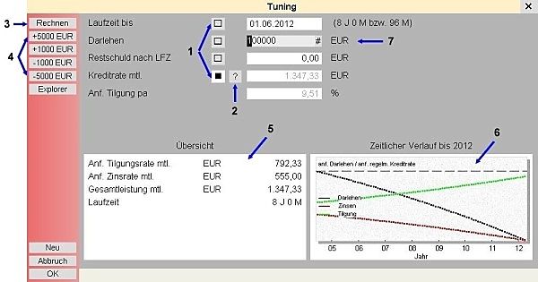 Klicken Sie den Rechenziel-Schalter (1) vor dem Eingabefeld an, dessen Wert berechnet werden soll. Geben Sie in den übrigen Eingabefeldern die weiteren Vertragsdaten ein und klicken Sie den Berechnungs-Schalter (2) an. ( (3) hat die gleiche Funktion.) Das Rechenziel wird bestimmt und Vertragsdaten (5) sowie grafischer Verlauf (6) aktualisiert. Wenn Sie einen der "Ändern"-Schalter (4) anklicken, wird der Wert im aktiven Eingabefeld (7) um den Betrag geändert, der auf dem "Ändern"-Schalter angezeigt wird. Im Anschluss wird automatisch eine Berechnung durchgeführt. Klicken Sie die Grafik (8) an, um die Grafen für Darlehen, Tilgung und Zinsen einzeln anzuzeigen. Weitere Möglichkeiten und Hinweise Sie können von hier aus den Explorer Für weitere detaillierte Informationen öffnen. zwischenfinanzierung, staatliche förderung, miete, analyse, kapitallebensversicherung, instandhaltungskosten, tilgung, mindestsparguthaben, sperrfrist, risiko, schnellsparer, sparkasse, vorausdarlehen, auflassungsvormerkung, refinanzierung, kapitallebensversicherung, fördertopf, aufwendungsdarlehen, checkliste, soforteinzahlung, jährliche leistung, zinsunterschied, finanzierungsvolumen, zinsrisiko, gesamtkostenermittlung, zuteilungstermine, vermietungsgewinn, modernisierung, ehzdarlehen, zinserhöhungsrisiko, einkommensgrenze, baurisiko, passivhaus, mieteinnahmen, einmaltilgung, endfälliger kredit, vl, versicherungssumme, vermieter, geldinstitute, dispositionskredit, nutzfläche, einkommensgrenze, eigenbedarf, brutto, instandsetzungskosten, finanzierungswege, nominalschuld, wegbeschreibung, bankgebühren, mischzins, abschnittsfinanzierung, verbraucherzentralen, konstantmodelle, bgb-vertrag, mietersparnis, ausbauhaus, strategie, bauherrenhaftpflicht, kreditnehmer, sparbeitrag, zinsfreies darlehen, saldieren, steuervorteil, onlineberatung, vermietungseinkünfte, vorfälligkeitsentschädigung, mietsache, geld vom staat, festschreibung, hausbau, abschlussprovision, kreditnehmer, teilbausparvertrag, beitragsbelastung, kaufvertrag, restlaufzeit, grundpfandrecht, tilgungsphase, mietpreisinflation, haftpflicht, wartezeit, wiederanlage, notaranderkonto, darlehnssumme, fertigstellungsbescheinigung, leistung, prämienhöhe, onlinefinanzierung, kreditanstalt für wiederaufbau, richtig finanzieren, darlehensbedarf, immobilienkauf, einmaltilgung, vk, vertragsinhalt, restfinanzierung, kreditantrag, notarkosten, wohnraumförderungsgesetz, maklerprovision, kapital, gutachten, teilungserklärung, risikominimierung, sofortfinanzierung, variabler zinssatz, währung, mobile datensysteme, fond, bausparberatung, kontoführungsgebühren, konstant, nachrangig, fördergrundbetrag, geld vom staat, prämienhöhe, einnahmen, überziehungskredit, dispositionskredit, verjährung, onlinebaufinanzierung, sparkassenberatung, sparleistung, saldensumme, anfahrtskizze, versicherungsrendite, barwert, antragsteller, eigentumswohnung, zinsvorteil, niedrigzinsphase, kosten, vd, zwischenkredit, wohnraum, umbau, fertigstellungsbescheinigung, risiko, steuerlicher freiraum, wirtschaftlichkeit, verjährung, vollmacht, bankkredit, kreditkündigung, architektenhaus, fördermittel, geld, monatliche belastung, wiederanlage, kreditvertrag, falschberatung, notaranderkonto, zulagedarlehen, gesamtkosten, zinsrisiko, sparquote, sparbrief, instandhaltung, passivhaus, nominalschuld, risikozuschlag, aktien, annuitätendarlehen, lebenshaltung, prämie, onlineberatung, sicherheit, bausparkasse, systemhaus, ablösen, bankberatung, modernisierung, notargebühren, kontoführung, lv, gesamtlaufzeit, belastungssprung, wohneigentum, zinsrisiko, teilvertrag, kinderzulage, gewinn, Verkaufsgewinn, wärmepumpen, umschuldung, notargebühren, mietsache, monatliche sparleistung, überfinanzierung, ablaufleistung, dispositionskredit, steuerlicher verlust, grunderwerbsteuer, diensbarkeiten, antragsteller, gebäudekosten, kfw-kredit, variable darlehen, grundförderung, variable kondition, vorfinanzierungsdarlehen, basel II, modernisierungskosten, einkommensteuer, kombikredit, zvst einkommen, modernisieren, kreditangebot, mindestbewertungszahl, monatliche belastung, versicherungsrendite, gesamtkosten, solaranlagen, finanz, zinsleistung, steuervorteil, steuerliche belastung, kostenfaktor, vorfinanzierungsdarlehen, bauantrag, zk, teilablösung, antragsteller, mietertrag, sicherheitentausch, kleinsummenzuschlag, notarkosten, westlb, steuer, herstellungskosten, einkommensgrenze, finanzierungsaufbau, schätzkosten, betriebskosten, tilgungsplan, instandhaltungskosten, instandhaltung, bonität, investitionskosten, zinssicherheit, wohneigentumsprogramm, darlehenszins, zinsen, rücktritt, basel II, immobilienfinanzierung, risikominimierung, geldanlage, variable darlehen, zinsgarantie, baurisiko, zielbewertungszahl, abschreibungssatz, prämienhöhe, vorfälligkeitsentschädigung, leistung, zuteilungsrisiko, darlehensbedarf, anfängliche tilgung, nettoeinkommen, lebenshaltungskosten, fondrendite, nominalschuld, wohngebäudeversicherung, rate, immobilienfont, architektenhonorar, konstant, mietvertrag, kreditantrag, vermietungsgewinn, immobilie, sondertilgungen, beitragszahlung, hausbank, langläufer, sicherheiten, bauen, architektenhaus, variabler zinssatz, immobilienfinanzierung, wohnungsbauprämie, darlehen, regelbesparung, verrechnung, beitrag, zuteilungstermine, vl, immobilienkauf, dritter förderweg, vis.a.vis, altbau, kaufen, tilgungsbelastung, tilgungsbelastung, einmalzahlung, niedrige zinsen, zinssicherung, hausrat copyright 2005 Dr. Stephan Dreher |