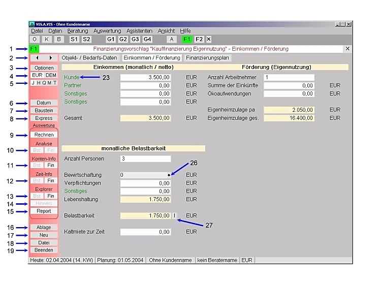 Hiermit öffnen Sie die Eingabemaske der Kundendatenbank. Hinweis: Die für den Ausdruck relevanten Daten werden in den Masken des Finanzierungsvorschlags abgefragt.
