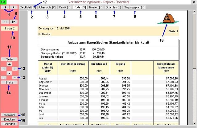 Sie können die einzelnen Vorschau durch Anklicken der Maskenwahl-Schalter (1) bzw. der Reiter (2) bis (8) zur Ansicht bringen. Einige Vorschauen enthalten mehr als eine Seite. In diesem Fall können Sie mit den Seiten-Schaltern (9) durchblättern. Die Seiten-Anzeige (10) dient dabei als Orientierung. Das Anzeigefenster ist normalerweise zu klein, um die gesamte Seite zu zeigen. Eine Gruppe von Navigations-Schaltern (11) bis (14) hilft Ihnen, die Informationen optimal darzustellen. Wenn Sie über einen großen Bildschirm verfügen, können Sie durch Anklicken von (11) das Anzeigefenster in der Höhe vergrößern. Mit den Navigations-Schaltern (12) können Sie das Anzeigefenster über das Blatt bewegen. Mit den Zoom-Schaltern (13) können Sie den Fenster-Inhalt vergrößern bzw. verkleinern. Mit dem Schalter (14) können Sie die Breite des Anzeige-Fensters optimal nutzen. Das Logo (18), das auf jeder Seite mit ausgedruckt werden kann, können Sie bei Logos und Grafiken vorgeben. Was Sie letztlich dem Kunden ausdrucken wollen, entscheiden Sie durch Ankreuzen der Felder (17) oder in dem Auswahl-Dialog, den Sie durch Anklicken von (15) öffnen. Den Ausdruck-Dialog öffnen Sie durch Anklicken von (16). Weitere Möglichkeiten und Hinweise Sie können die Report-Vorschau erst öffnen, wenn ausreichend Eingabedaten vorhanden sind. Ansonsten ist der Report-Schalter in der Kontroll-Leiste deaktiviert. restlaufzeit, tarif, vorfinanzierungskredit, kreditrahmen, verkaufsgebühr, kreditinstitut, vl, finanzberatung, energiekosten, maklerkosten, restlaufzeit, fertigstellung, finanzierungsbedarf, zinsfestschreibung, maklercourtage, darlehensbedarf, Verkaufserlös, ablösesumme, jahresbeitrag, ablösen, miete, bewirtschaftungskosten, dispositionskredit, sparzulage, maklerlohn, kreditantrag, bonuszinsen, endwert, finanzierungsrisiko, kaufpreis, fördertopf, investition, energiesparhaus, sparzulage, grunderwerbsteuer, unterfinanzierung, gewährleistung, versicherungskündigung, mieteinnahmen, sparerfreibetrag, überschussanteile, instandsetzungskosten, wiederanlage, mieteinnahmen, notarvertrag, finanzierungskosten, gesamtfinanzierung, standort, investitionszulagen ost, gebrauchtimmobilie, tilgungskonzept, hypothekar codex, hochzinsphase, beratung, fest bis zuteilung, antragstellung, hohe zinsen, baufinanzierung, nutzfläche, brutto, beleihung, modernisierungsförederung, bezirksleiter, grundbuchgebühren, bewirtschaftungskosten, gesamteffektivzins, verlustrechnung, bankgebühren, fremdbedarf, erschließung, bauvertrag, mietertrag, selbstnutzer, rückzahlung, arbeitgeberdarlehen, gesamtfinanzierung, sparplan, tarif, finanzierungskosten, kinderzulage, berater, zinserhöhungsrisiko, tbv, altersvorsorge, anfangskredit, länderförderung, kfw-kredit, aibd, vk, energieeinsparung, finanzierungswege, regeltilgung, sparvertrag, dispositionskredit, kapitallebensversicherung, bonuszinsen, solaranlagen, hypothekenzinsen, einkommenssteigerung, direktbanken, fördermittel, vermögenswirksame leistung, hypothekenzinsen, bauvertrag, modernisierungskosten, baupasen, versicherungskündigung, wohneigentumsbauförderung, tilgungsfrei, kodex, sparzeit, kapitallebensversicherung, kauffinanzierung, kombinieren, hausbau, finanzplanung, mindestbesparung, beratung, annuität, hausrat, mindestbewertungszahl, fördergrundbetrag, vorauskredit, bewertungszahl, kreditbedarf, vis-a-vis, strategie, bauleistungsversicherung, zuteilungsperioden, vertragsinhalt, beleihungsgrenze, restlaufzeit, kapitallebensversicherung, spekulationsfrist, prämiensparer, basel 2, kapital, bauland, freibetrag, lebensversicherungen, anschaffungskosten, vgh, zinsgarantie, notarkosten, nominalzins, renovierungskosten, geld vom staat, ehzdarlehen, rendite, überziehungskredit, steigende belastung, codex, hausbank, finanzielle belastbarkeit, bruttoeinkommen, eigentumserwerb, zinsbonus, kreditvertrag, passivprodukte, betriebskosten, zinsbelastung, tilgungskonzept, wertermittlungsgebühren, investitionskosten, konstant, vk, kreditzins, fördermittel, saldensumme, sparziel, onlineberatung, kinderzulage, steigende tilgung, versicherungskündigung, eigenkaptialbildung, mietsache, sparbrief, kapital, arbeitszimmer, einkommensgrenze, monatliche sparleistung, bonus, steuersatz, risiko, nettokreditbetrag, tilgungsbeitrag, eigenbau, hausrat, risikominimierung, kaufpreis, kreditsicherung, bgb-vertrag, gesamtleistung, kaltmiete, makler, zinsverechnung, renovierungskosten, bauträgermodell, eigenheim, zinsverechnung, wohneigentum, sondertilgungen, bauunternehmer, analyse, fördertöpfe, sonderausgaben, spekulation, sparerfreibetrag, sparplan, vermietungsgewinn, saldensumme, geld, bereitstellungszinsen, systemhaus, sicherheitentausch, hausrat, steuerfreiheit, bausparberatung, energiekosten, endwert, gesamteffektivzins, herstellungskosten, vermittlungsprovision, mindestbesparung, überziehungskredit, darlehenszins, steigende belastung, finanzierungsrisiko, wärmepumpen, eigenbedarf, fremdkapital, kosten, beratungshaftung, grundzulage, jahresbeitrag, leitzinsen, darlehensbedarf, architektenhonorar, restlaufzeit, fest bis zuteilung, hypothekar codex, barwertvergleich, aktienfont, anschlussfinanzierung, überschussanteile, auflassungsvormerkung, restfinanzierung, berater, tilgungsfrei, belastungssprung, selbstnutzung, explorer, sondertilgungsrecht, kaufen, annuität, steuersatz, steuer, makler, zwangsversteigerung, wohnraum, planungssicherheit, tilgungswahlrechte, wohngebäudeversicherung, marge, sondertilgungen, solaranlagen, generalunternehmermodell, flexibel tilgen, wechselkosten, zinsmargenschaden, bausparvertrag, bewertungszahl, freibetrag, kombination, nominalschuld, hausbank, lv, grundbuchkosten, darlehen, altersvorsorge, zinsbelastung, kaufvorhaben, eigenbau, beitragsdauer, nachrangzuschlag, bauland, investitionsaufwand, tilgungskonzept, investitionsaufwand, baustein, guthabenzins, vorzeitige ablösung, vorfinanzierungskredit, instandsetzung, leistung, bauherr, energiekosten